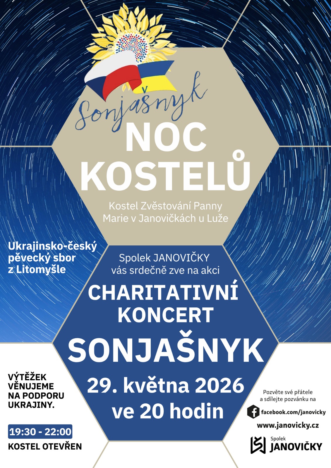 Srdečně zveme na noc kostelů v Janovičkách 29.5.2026 od 19:30 do 22:00Koncert ukrajinsko´-českého souboru z Litomyšle SONJAŠNYK proběhne od 20:00Výtěžek věnujeme na podporu Ukrajiny.